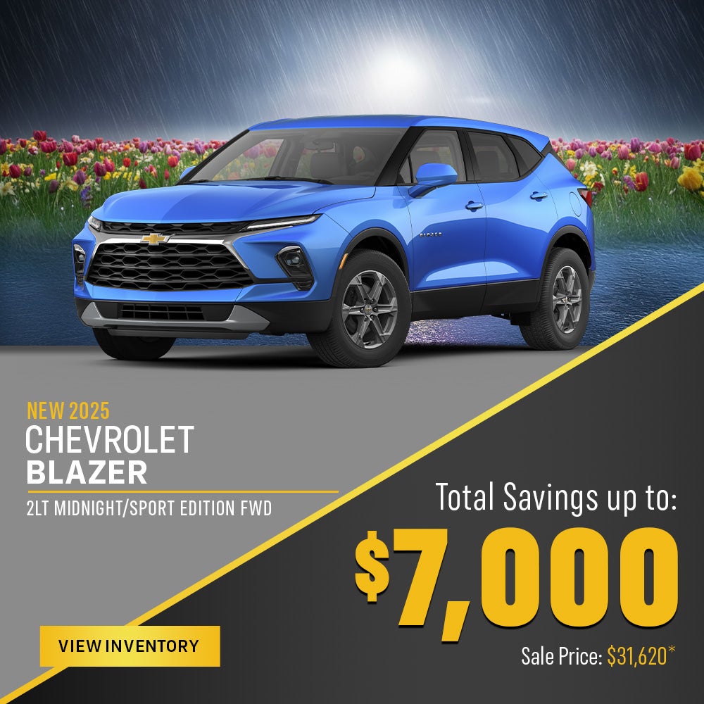 *New 2025 Chevrolet Blazer 2LT Midnight/Sport Edition FWD. Stock #D29573. MSRP: $38,620. Price Includes: -$6,000 Dealer Discount and -$1,000 Consumer Cash. Can not be combined with some other offers. See dealer for details. not available with special financing, lease and some other offers. Tax, title, $499 documentation fee, $899 appearance package and license extra. See Dealer for details. Model shown for illustration purposes only. Take retail delivery by 05/04/26.
