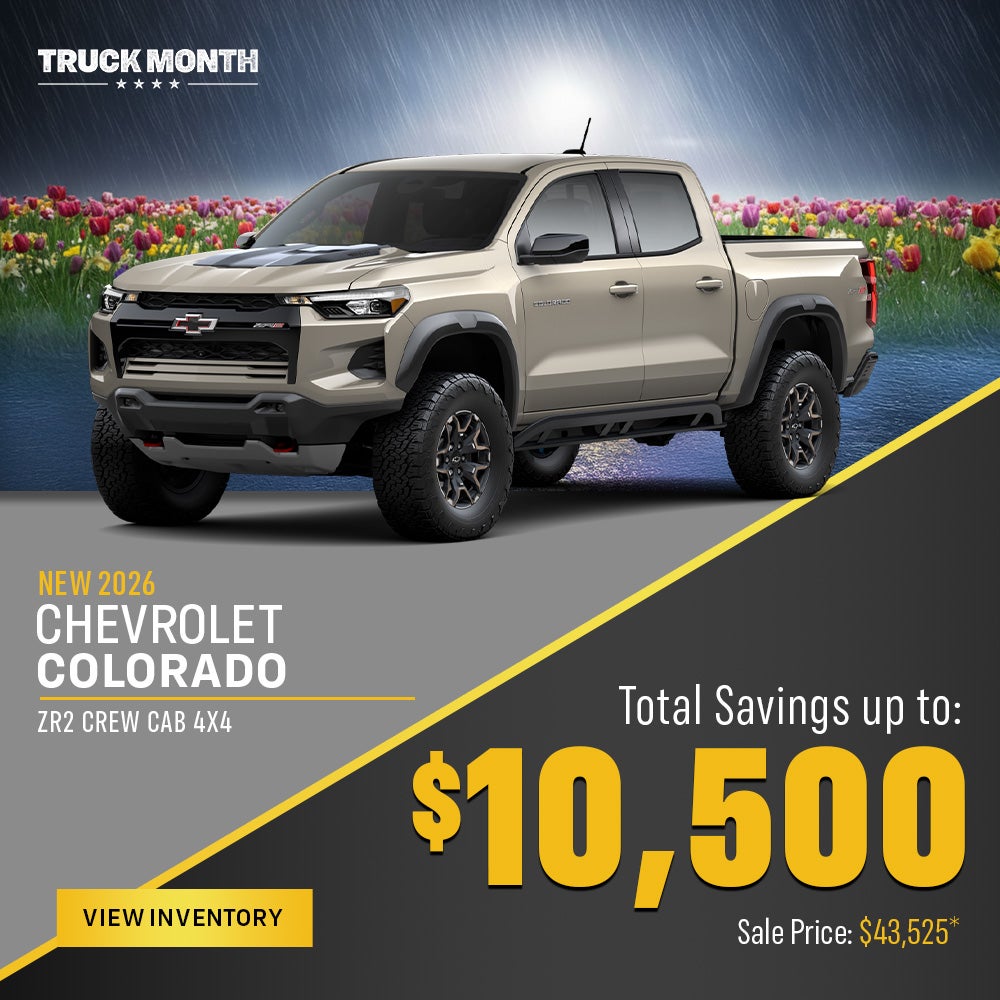 *New 2026 Chevrolet Colorado ZR2 Crew Cab 4X4. Stock # 29595. MSRP: $43,525. Price Includes: -$10,000 Dealer Discount and -$500 Consumer Cash. Can not be combined with some other offers. See dealer for details. not available with special financing, lease and some other offers. Tax, title, $499 documentation fee, $899 appearance package and license extra. See Dealer for details. Model shown for illustration purposes only. Take retail delivery by 05/04/26.