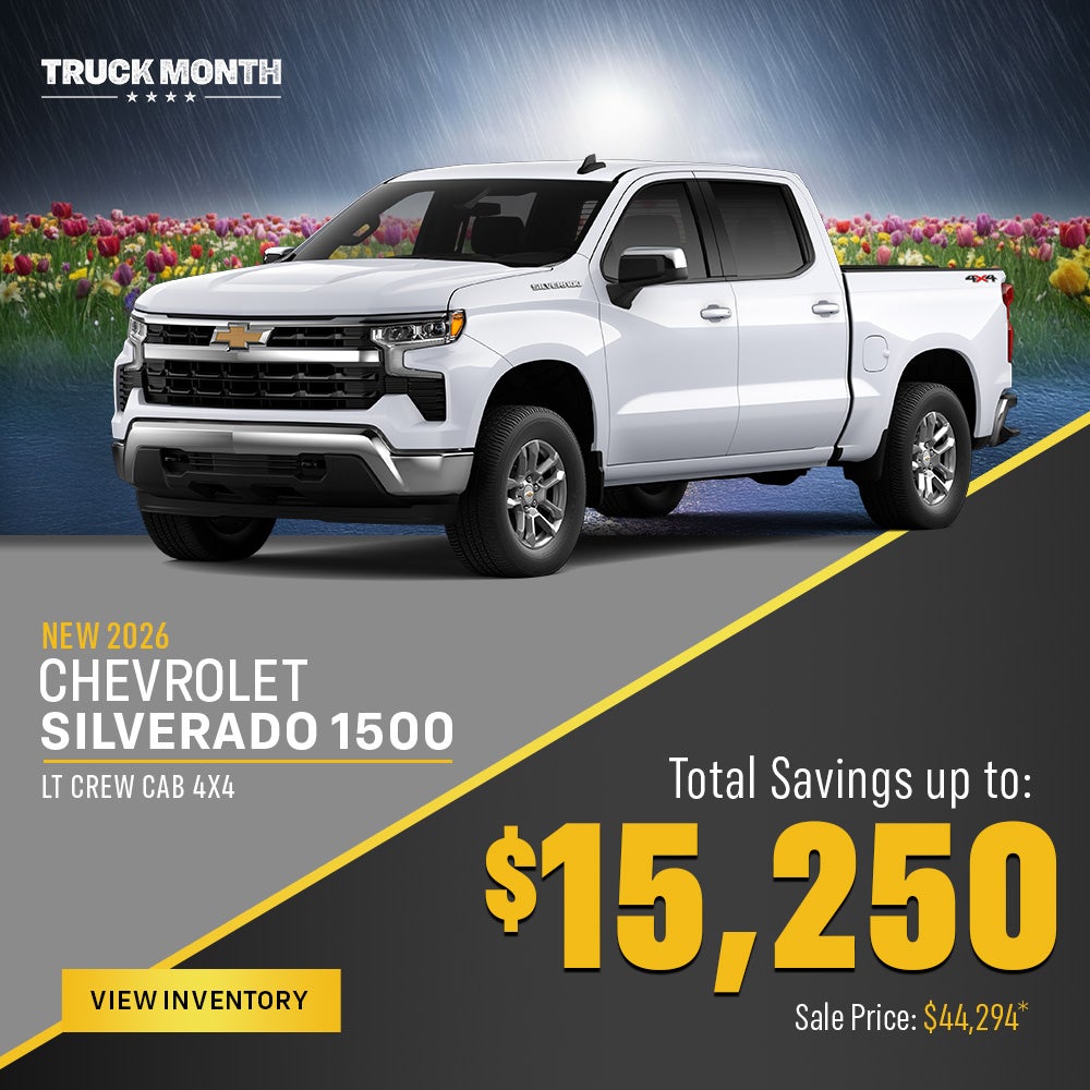 *New 2026 Chevrolet Silverado 1500 LT Crew Cab 4X4. Stock # 28988. MSRP: $59,544. Price Includes: -$10,500 Dealer Discount, -$4,250 Consumer Cash, and -$500 Bonus Cash, can not be combined with some other offers. See dealer for details. not available with special financing, lease and some other offers. Tax, title, $499 documentation fee, $899 appearance package and license extra. See Dealer for details. Model shown for illustration purposes only. Take retail delivery by 05/04/26.
