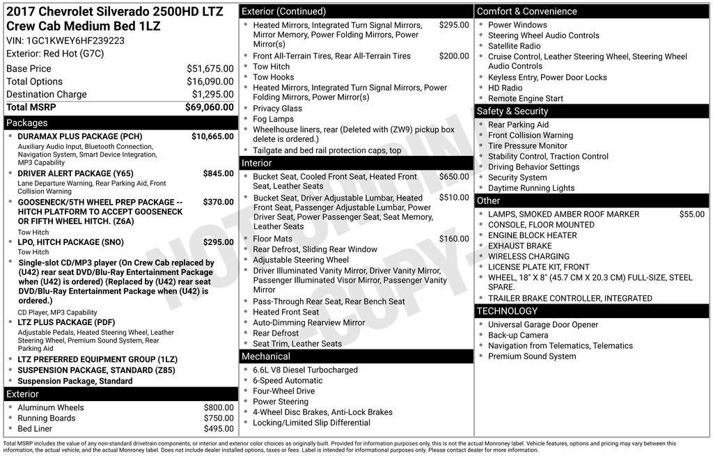 This 2017 Chevrolet Silverado 2500HD LTZ is a true workhorse, built to handle the toughest jobs with ease and comfort. With its powerful Duramax 6.6L V8 Turbodiesel engine and Allison 1000 6-speed automatic transmission, this truck is ready to tackle any challenge you throw its way.- UNREAL!!!! SUPER CLEAN UNIT, DON'T MISS THIS TRUCK IF YOU ARE WANTING A SUPER CLEAN OLDER DIESEL- Seats, Front Full-Feature Leather-Appointed Bucket with Heated and Vented Seating- Bed Liner, Spray-On with Bowtie Logo- Mirrors, Chrome, Outside Heated Power-Adjustable Vertical Trailering, Memory-Equipped, Upper Glass, Power-Folding and Manual Extending- Duramax Plus Package with Exhaust Brake- Wheels, 20 6-Spoke Polished Aluminum- Driver Alert Package with Lane Departure Warning, Forward Collision Alert, Safety Alert Seat, and Front and Rear Park Assist- Gooseneck/5th Wheel Prep PackageThis Silverado is not only powerful, but it's also packed with premium features that will make your driving experience more comfortable and convenient. The leather-appointed heated and vented front bucket seats provide unparalleled comfort, while the Duramax Plus Package adds even more capability with the Exhaust Brake and Allison transmission.The attention to detail is evident throughout, from the spray-on bed liner to the chrome exterior accents. The Driver Alert Package and Gooseneck/5th Wheel Prep Package further enhance the Silverado's versatility, making it the ultimate tool for work or play.Whether you're hauling heavy loads, towing a trailer, or simply enjoying the open road, this 2017 Chevrolet Silverado 2500HD LTZ is the perfect companion. Its impressive performance, premium features, and exceptional craftsmanship make it a standout in the heavy-duty truck segment.We invite you to come in and experience the power and capability of this remarkable Silverado for yourself. Our knowledgeable sales team is ready to answer any questions you may have and help you find the perfect vehicle to meet your needs. Don't miss your chance to own this exceptional truck – visit us today and let us show you why the Silverado 2500HD LTZ is the ultimate choice for discerning truck buyers.