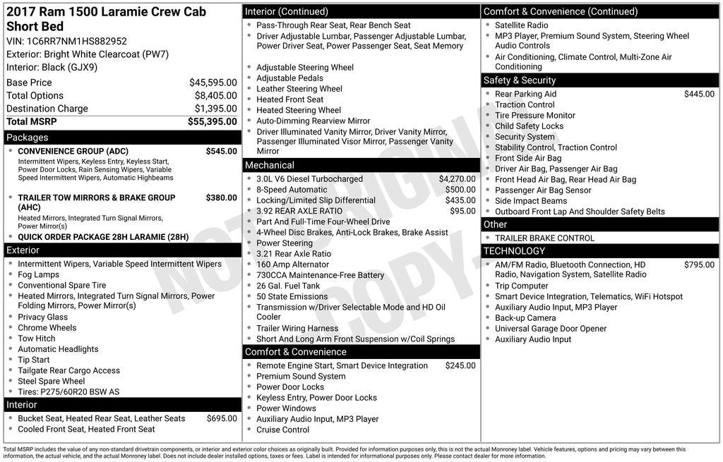 2017 Ram 1500 Laramie Bright White Clearcoat EcoDiesel 3.0L V6 4WDRecently Serviced.Clean CARFAX.This vehicle has been through a multi-point inspection by an ASE Certified technician. All identified issues deemed necessary were fixed. Fully detailed and ready for immediate delivery. Our Chevrolet Finance Center works with all credit types from good to bad. Get Pre-Approved for an auto loan now by clicking the Pre-Qualify link at the bottom of the page.Huge Tulsa used car superstore. When it comes to Auto Financing, every consumer is looking for two things: Affordable car loan rates and flexible auto loan terms.With Ally Financial Services you get both and more! We offer competitive Auto Finance rates on new and used Chevrolet vehicles as well as GM Certified Pre-Owned Vehicles. In addition, take a look at other used car brands that we have on our lot at reduced pricing. At Jim Norton Chevrolet we sell cars at prices our customers in Tulsa, Broken Arrow, Bristow, Bixby, Owasso and Oklahoma City can afford.At Jim Norton Chevrolet in Broken Arrow all new cars, trucks, and SUVS come with the Jim Norton Family Plan! That means you get Lifetime Engine Protection, Free Service Loaners w/ Service Appointments, the Guaranteed Lowest Price on Tires, and a 3 Day Exchange Policy! *Excludes Commercial Vehicles, Corvettes, and Diesels. Who does all that?! The Norton family has been serving Broken Arrow, Bixby, Jenks, Tulsa, Oklahoma City, Missouri and Arkansas for over 80 Years. Visit us at www.jimnortonchevy.com Jim Norton's Advertised Price includes Dealer Documentation Fee of $499.
