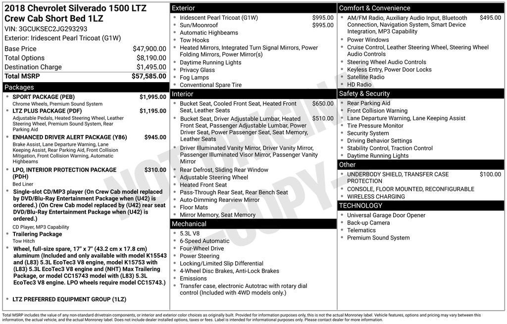2018 Chevrolet Silverado 1500 LTZ Iridescent Pearl Tricoat EcoTec3 5.3L V8 4WDRecently Serviced, 6-Speed Automatic Electronic with Overdrive, 4WD, Cocoa/Dune Leather.Clean CARFAX.This vehicle has been through a multi-point inspection by an ASE Certified technician. All identified issues deemed necessary were fixed. Fully detailed and ready for immediate delivery. Our Chevrolet Finance Center works with all credit types from good to bad. Get Pre-Approved for an auto loan now by clicking the Pre-Qualify link at the bottom of the page.Huge Tulsa used car superstore. When it comes to Auto Financing, every consumer is looking for two things: Affordable car loan rates and flexible auto loan terms.With Ally Financial Services you get both and more! We offer competitive Auto Finance rates on new and used Chevrolet vehicles as well as GM Certified Pre-Owned Vehicles. In addition, take a look at other used car brands that we have on our lot at reduced pricing. At Jim Norton Chevrolet we sell cars at prices our customers in Tulsa, Broken Arrow, Bristow, Bixby, Owasso and Oklahoma City can afford.Awards:* 2018 KBB.com 10 Most Awarded BrandsAt Jim Norton Chevrolet in Broken Arrow all new cars, trucks, and SUVS come with the Jim Norton Family Plan! That means you get Lifetime Engine Protection, Free Service Loaners w/ Service Appointments, the Guaranteed Lowest Price on Tires, and a 3 Day Exchange Policy! *Excludes Commercial Vehicles, Corvettes, and Diesels. Who does all that?! The Norton family has been serving Broken Arrow, Bixby, Jenks, Tulsa, Oklahoma City, Missouri and Arkansas for over 80 Years. Visit us at www.jimnortonchevy.com Jim Norton's Advertised Price includes Dealer Documentation Fee of $499.