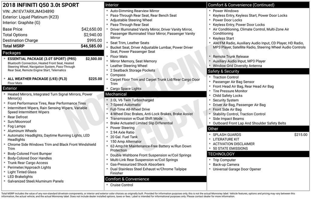 2018 INFINITI Q50 Sport Liquid Platinum 3.0L V6 AWDRecently Serviced.This vehicle has been through a multi-point inspection by an ASE Certified technician. All identified issues deemed necessary were fixed. Fully detailed and ready for immediate delivery. Our Chevrolet Finance Center works with all credit types from good to bad. Get Pre-Approved for an auto loan now by clicking the Pre-Qualify link at the bottom of the page.Huge Tulsa used car superstore. When it comes to Auto Financing, every consumer is looking for two things: Affordable car loan rates and flexible auto loan terms.With Ally Financial Services you get both and more! We offer competitive Auto Finance rates on new and used Chevrolet vehicles as well as GM Certified Pre-Owned Vehicles. In addition, take a look at other used car brands that we have on our lot at reduced pricing. At Jim Norton Chevrolet we sell cars at prices our customers in Tulsa, Broken Arrow, Bristow, Bixby, Owasso and Oklahoma City can afford.Awards:* 2018 KBB.com 10 Best Luxury Cars Under $35,000At Jim Norton Chevrolet in Broken Arrow all new cars, trucks, and SUVS come with the Jim Norton Family Plan! That means you get Lifetime Engine Protection, Free Service Loaners w/ Service Appointments, the Guaranteed Lowest Price on Tires, and a 3 Day Exchange Policy! *Excludes Commercial Vehicles, Corvettes, and Diesels. Who does all that?! The Norton family has been serving Broken Arrow, Bixby, Jenks, Tulsa, Oklahoma City, Missouri and Arkansas for over 80 Years. Visit us at www.jimnortonchevy.com Jim Norton's Advertised Price includes Dealer Documentation Fee of $499.