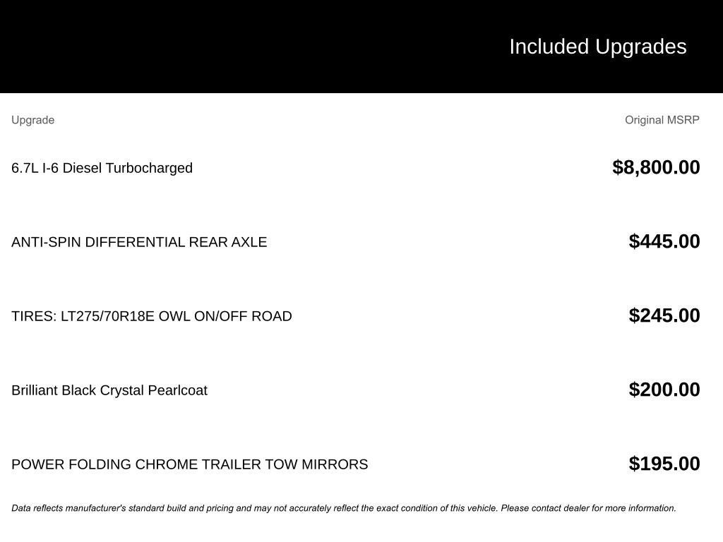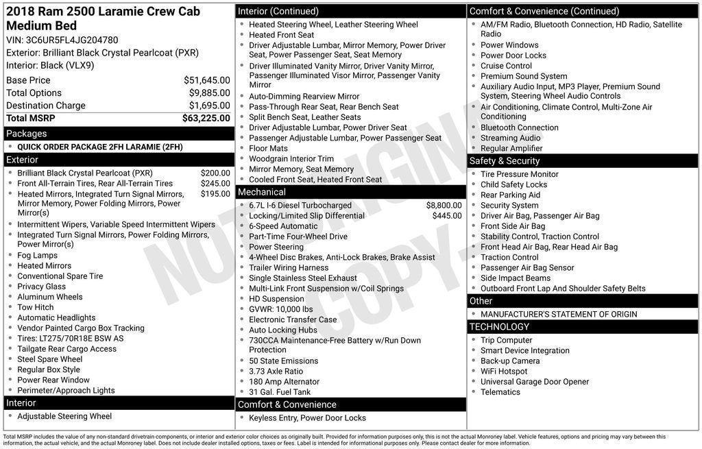 2018 Ram 2500 Laramie Brilliant Black Crystal Pearlcoat Cummins 6.7L I6 Turbodiesel 4WDRecently Serviced.This vehicle has been through a multi-point inspection by an ASE Certified technician. All identified issues deemed necessary were fixed. Fully detailed and ready for immediate delivery. Our Chevrolet Finance Center works with all credit types from good to bad. Get Pre-Approved for an auto loan now by clicking the Pre-Qualify link at the bottom of the page.Huge Tulsa used car superstore. When it comes to Auto Financing, every consumer is looking for two things: Affordable car loan rates and flexible auto loan terms.With Ally Financial Services you get both and more! We offer competitive Auto Finance rates on new and used Chevrolet vehicles as well as GM Certified Pre-Owned Vehicles. In addition, take a look at other used car brands that we have on our lot at reduced pricing. At Jim Norton Chevrolet we sell cars at prices our customers in Tulsa, Broken Arrow, Bristow, Bixby, Owasso and Oklahoma City can afford.At Jim Norton Chevrolet in Broken Arrow all new cars, trucks, and SUVS come with the Jim Norton Family Plan! That means you get Lifetime Engine Protection, Free Service Loaners w/ Service Appointments, the Guaranteed Lowest Price on Tires, and a 3 Day Exchange Policy! *Excludes Commercial Vehicles, Corvettes, and Diesels. Who does all that?! The Norton family has been serving Broken Arrow, Bixby, Jenks, Tulsa, Oklahoma City, Missouri and Arkansas for over 80 Years. Visit us at www.jimnortonchevy.com Jim Norton's Advertised Price includes Dealer Documentation Fee of $499.
