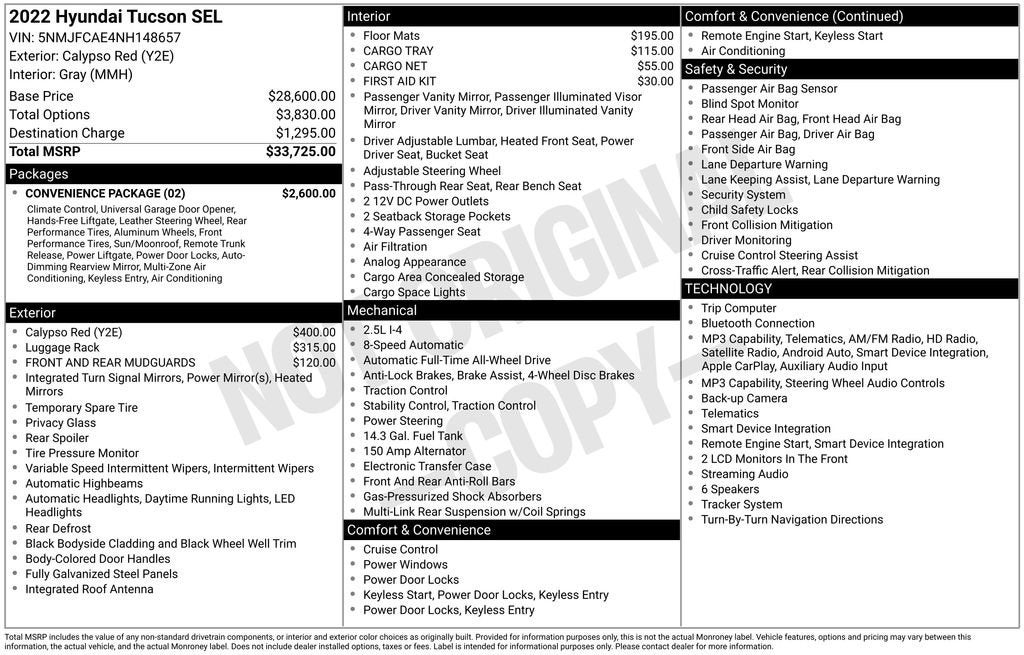 2022 Hyundai Tucson SEL Calypso Red 2.5L I4 DGI DOHC 16V LEV3-ULEV70 187hp AWDRecently Serviced, AWD.Clean CARFAX.This vehicle has been through a multi-point inspection by an ASE Certified technician. All identified issues deemed necessary were fixed. Fully detailed and ready for immediate delivery. Our Chevrolet Finance Center works with all credit types from good to bad. Get Pre-Approved for an auto loan now by clicking the Pre-Qualify link at the bottom of the page.Huge Tulsa used car superstore. When it comes to Auto Financing, every consumer is looking for two things: Affordable car loan rates and flexible auto loan terms.With Ally Financial Services you get both and more! We offer competitive Auto Finance rates on new and used Chevrolet vehicles as well as GM Certified Pre-Owned Vehicles. In addition, take a look at other used car brands that we have on our lot at reduced pricing. At Jim Norton Chevrolet we sell cars at prices our customers in Tulsa, Broken Arrow, Bristow, Bixby, Owasso and Oklahoma City can afford.At Jim Norton Chevrolet in Broken Arrow all new cars, trucks, and SUVS come with the Jim Norton Family Plan! That means you get Lifetime Engine Protection, Free Service Loaners w/ Service Appointments, the Guaranteed Lowest Price on Tires, and a 3 Day Exchange Policy! *Excludes Commercial Vehicles, Corvettes, and Diesels. Who does all that?! The Norton family has been serving Broken Arrow, Bixby, Jenks, Tulsa, Oklahoma City, Missouri and Arkansas for over 80 Years. Visit us at www.jimnortonchevy.com Jim Norton's Advertised Price includes Dealer Documentation Fee of $499.