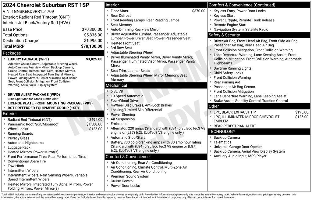 2024 Chevrolet Suburban RST Radiant Red Tintcoat EcoTec3 5.3L V8 4WDRecently Serviced.CARFAX One-Owner. Clean CARFAX.This vehicle has been through a multi-point inspection by an ASE Certified technician. All identified issues deemed necessary were fixed. Fully detailed and ready for immediate delivery. Our Chevrolet Finance Center works with all credit types from good to bad. Get Pre-Approved for an auto loan now by clicking the Pre-Qualify link at the bottom of the page.Huge Tulsa used car superstore. When it comes to Auto Financing, every consumer is looking for two things: Affordable car loan rates and flexible auto loan terms.With Ally Financial Services you get both and more! We offer competitive Auto Finance rates on new and used Chevrolet vehicles as well as GM Certified Pre-Owned Vehicles. In addition, take a look at other used car brands that we have on our lot at reduced pricing. At Jim Norton Chevrolet we sell cars at prices our customers in Tulsa, Broken Arrow, Bristow, Bixby, Owasso and Oklahoma City can afford.At Jim Norton Chevrolet in Broken Arrow all new cars, trucks, and SUVS come with the Jim Norton Family Plan! That means you get Lifetime Engine Protection, Free Service Loaners w/ Service Appointments, the Guaranteed Lowest Price on Tires, and a 3 Day Exchange Policy! *Excludes Commercial Vehicles, Corvettes, and Diesels. Who does all that?! The Norton family has been serving Broken Arrow, Bixby, Jenks, Tulsa, Oklahoma City, Missouri and Arkansas for over 80 Years. Visit us at www.jimnortonchevy.com Jim Norton's Advertised Price includes Dealer Documentation Fee of $499.