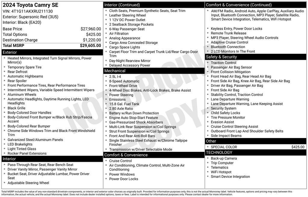ABS brakes, Active Cruise Control, Alloy wheels, Electronic Stability Control, Front dual zone A/C, Heated door mirrors, Illuminated entry, Low tire pressure warning, Remote keyless entry, Traction control.