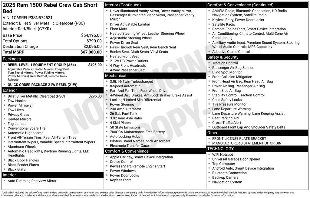 2025 Ram 1500 Rebel Billet Silver Metallic Clearcoat 3.0L I6 4WDRecently Serviced.CARFAX One-Owner.This vehicle has been through a multi-point inspection by an ASE Certified technician. All identified issues deemed necessary were fixed. Fully detailed and ready for immediate delivery. Our Chevrolet Finance Center works with all credit types from good to bad. Get Pre-Approved for an auto loan now by clicking the Pre-Qualify link at the bottom of the page.Huge Tulsa used car superstore. When it comes to Auto Financing, every consumer is looking for two things: Affordable car loan rates and flexible auto loan terms.With Ally Financial Services you get both and more! We offer competitive Auto Finance rates on new and used Chevrolet vehicles as well as GM Certified Pre-Owned Vehicles. In addition, take a look at other used car brands that we have on our lot at reduced pricing. At Jim Norton Chevrolet we sell cars at prices our customers in Tulsa, Broken Arrow, Bristow, Bixby, Owasso and Oklahoma City can afford.Awards:* Motor Trend Automobiles of the yearAt Jim Norton Chevrolet in Broken Arrow all new cars, trucks, and SUVS come with the Jim Norton Family Plan! That means you get Lifetime Engine Protection, Free Service Loaners w/ Service Appointments, the Guaranteed Lowest Price on Tires, and a 3 Day Exchange Policy! *Excludes Commercial Vehicles, Corvettes, and Diesels. Who does all that?! The Norton family has been serving Broken Arrow, Bixby, Jenks, Tulsa, Oklahoma City, Missouri and Arkansas for over 80 Years. Visit us at www.jimnortonchevy.com Jim Norton's Advertised Price includes Dealer Documentation Fee of $499.