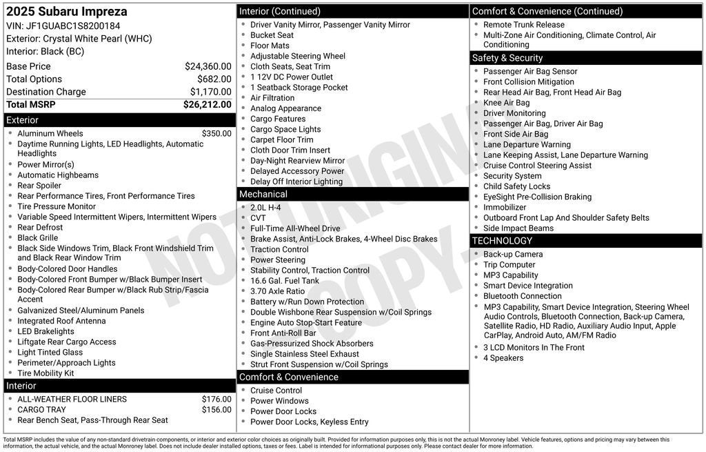 2025 Subaru Impreza Crystal White Pearl 2.0L DOHC AWD